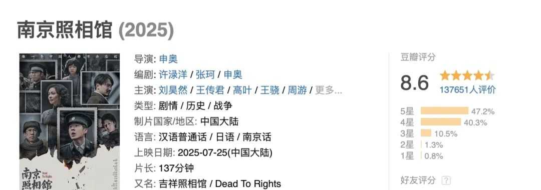《南京照相馆》取材于南京大屠杀期间日军真实罪证影像,聚焦于一家名为“吉祥照相馆”的避难所,讲述了老百姓留存日军屠城罪证照片的故事。该影片好评如潮,截至目前有约14万人在豆瓣平台打出了8.6的高分。