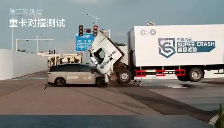 理想汽车发布的重卡连环撞击测试视频显示,正面对撞(100公里/小时)后,该车型A柱、B柱、C柱、门梁均无变形;侧面碰撞测试后,9个气囊全部打开,E-CALL自动触发,电池包无漏液、无起火,双闪灯点亮,A柱、B柱、C柱均无变形,车门自动解锁,门把手自动弹出。
