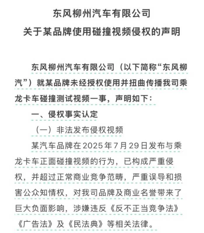 7月31日,东风柳汽发布关于某品牌使用碰撞视频侵权的声明称,某汽车品牌在2025年7月29日发布与乘龙卡车正面碰撞视频的行为,已构成严重侵权,并超过正常商业竞争范畴,严重误导和损害公众知情权,对公司品牌及商业名誉带来了巨大负面影响,涉嫌违反反不正当竞争法、广告法及民法典等相关法律。