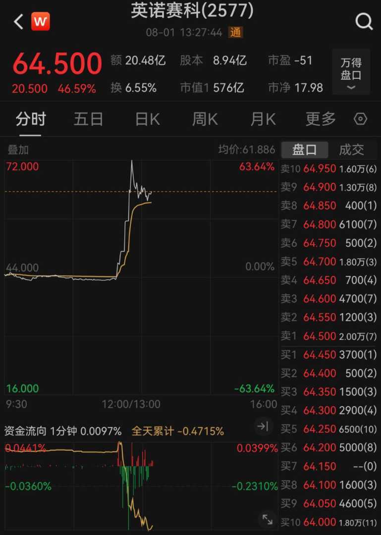 8月1日午后,英诺赛科(02577.HK)港股股价直线拉升,盘中一度涨超60%,截至13时27分,股价回落至46.59%,报64.5港元/股,总市值达576亿港元。