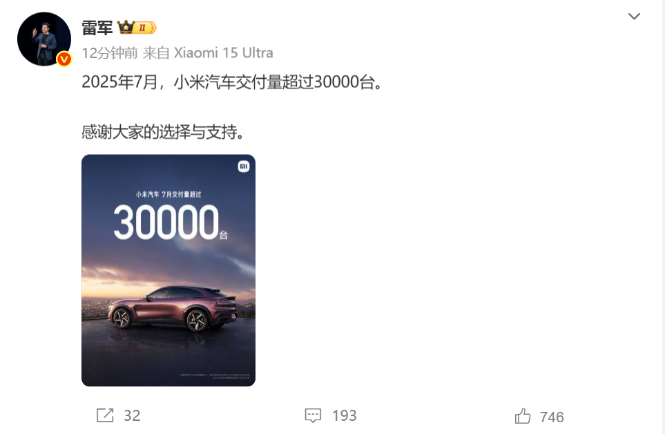 雷军发布微博称,2025年7月,小米汽车交付量超过30000台。据官微数据,这是小米汽车成立以来首次月度交付量突破3万台。另据官方消息,小米汽车决定从8月1日起,下架部分车漆颜色和配置选项。