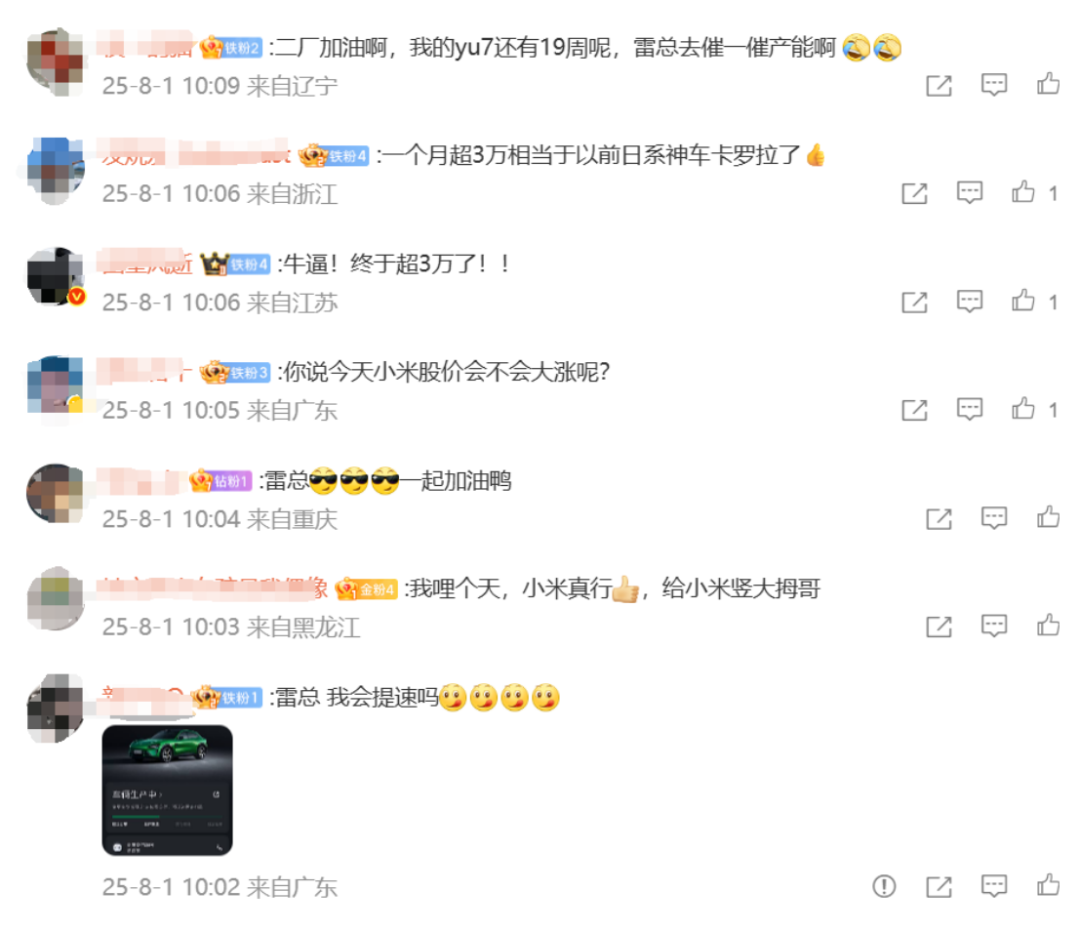 大量网友留言“催产能”。截至8月1日16:00,小米集团尾盘拉升,股价报53.8港元。