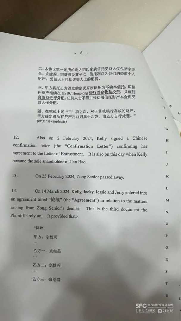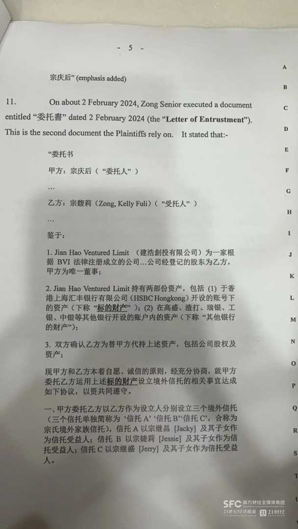 此前,21世纪经济报道记者从香港高等法院获得了娃哈哈集团现任董事长、宗庆后之女宗馥莉与三位号称“同父异母兄弟姐妹”的信托纠纷案起诉书复印件。