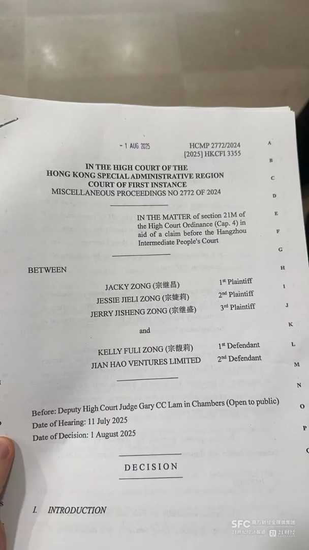 起诉书显示,香港高等法院在审阅原诉传票、原告及律师确认书、原告承诺书等证据资料后,发出了临时禁止令。此临时禁止令明确要求,宗馥莉、JIAN HAO Ventures Limited不得自行或通过代理人处置、处理或减少在汇丰银行账户内任何资产的价值,同时也不得处置或减少自2024年2月2日以来至禁令送达期间,存于汇丰账户内该等资产的替代财产或可追索收益,这一举措在财经界引发了广泛关注。