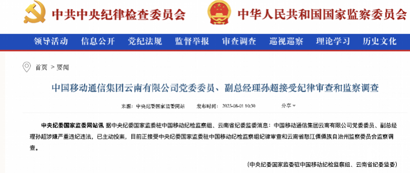 8月1日消息,中国移动通信集团云南有限公司党委委员、副总经理孙超涉嫌严重违纪违法,已主动投案,正接受纪律审查和监察调查。其曾担任多职,事件引发关注。