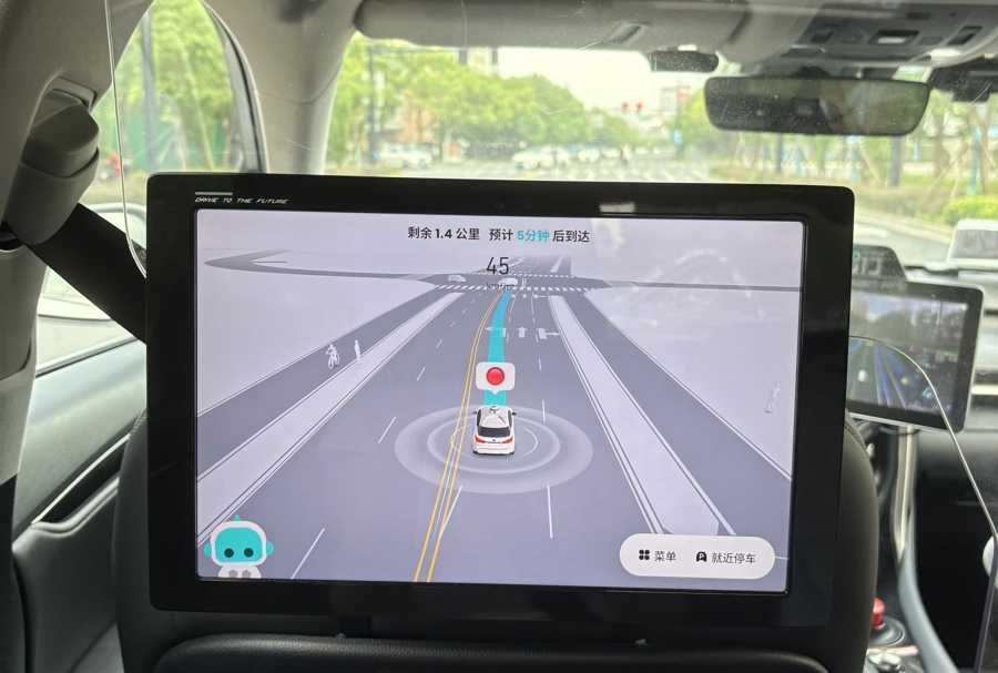 在副驾驶位上毛绒玩偶的陪伴下,乘客可以一边在车内显示屏上播放喜爱的音乐,一边查看路况。到达目的地后,无人驾驶出租车会通过语音和显示屏文字提示乘客在车辆尚未停稳前不要打开车门,以及带好随身物品等注意事项。如果这时检测到后方有车辆和行人接近车门,车辆还会发出警报,并提供车辆右侧的实时影像,以便乘客观察车外情况。