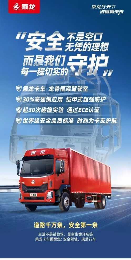 8月1日上午,乘龙卡车发布一张海报,海报上写着“安全不是空口无凭的理想,而是我们每一程切实的守护”。乘龙卡车在海报中写道,“道路千万条,安全第一条。生活不是试验场,莫拿生命开玩笑。乘龙卡车提醒您:安全驾驶,规范行车。”
