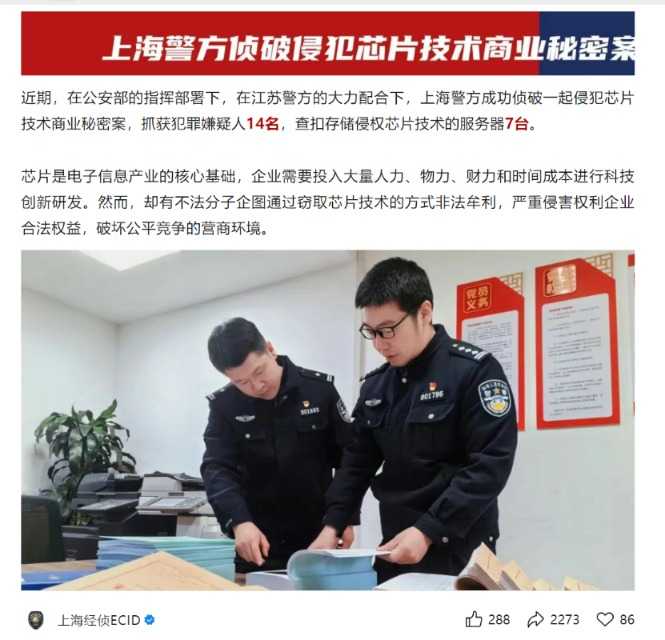 回溯过往,早在2023年,上海市公安局经侦总队就曾披露,在公安部的指挥部署下、在江苏警方的大力配合下,上海警方成功侦破一起侵犯芯片技术商业秘密案,抓获犯罪嫌疑人14名,查扣存储侵权芯片技术的服务器7台。