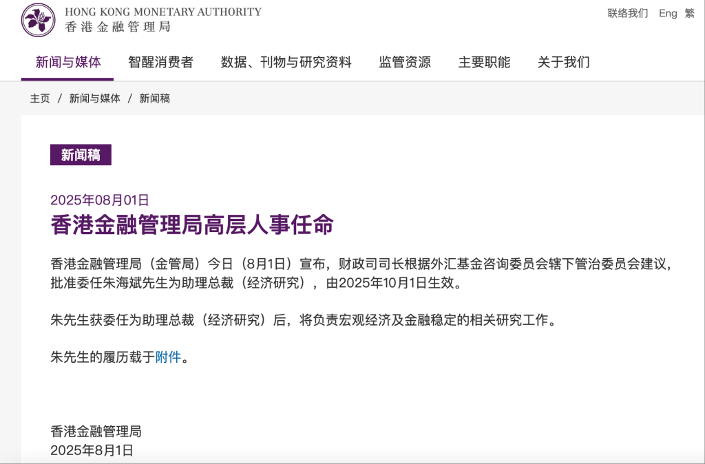 据香港金融管理局(简称“香港金管局”)官网8月1日消息,香港特区政府财政司司长根据外汇基金咨询委员会辖下管治委员会建议,批准委任朱海斌为助理总裁(经济研究),任命将于2025年10月1日生效。香港金管局指出,朱海斌获委任为助理总裁(经济研究)后,将负责宏观经济及金融稳定的相关研究工作。