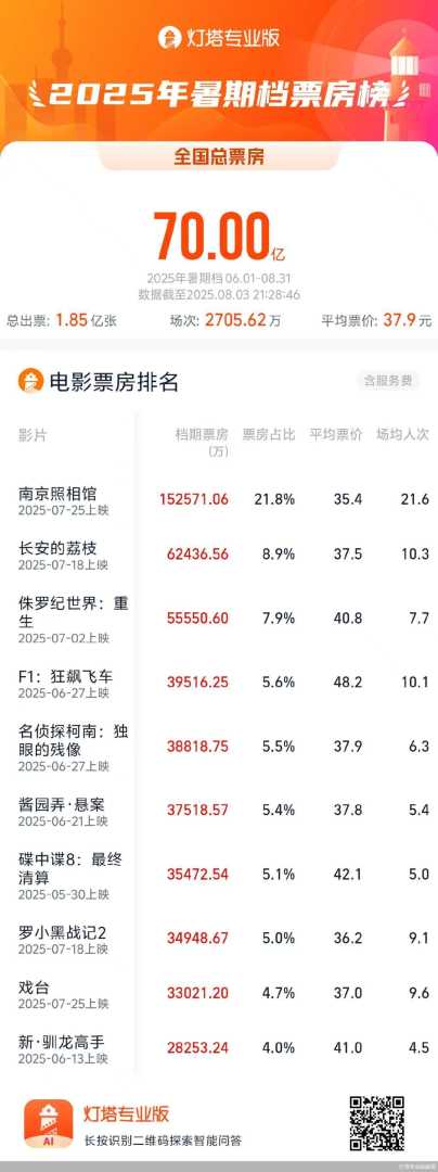 截至8月3日,2025年暑期档总票房突破70亿,单日票房破3.75亿创新高,彰显电影市场强劲复苏,观众对优质内容需求旺盛,行业恢复能力显著。