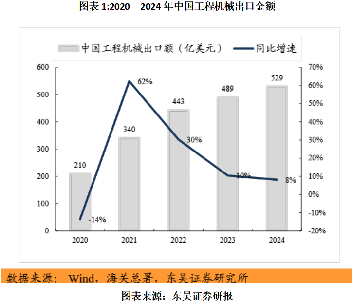 自2020年以来,中国工程机械出口金额持续增长。根据东吴证券报告,2020—2024年,我国工程机械出口金额从210亿美元增长至529亿美元,年复合增长率达到26%。