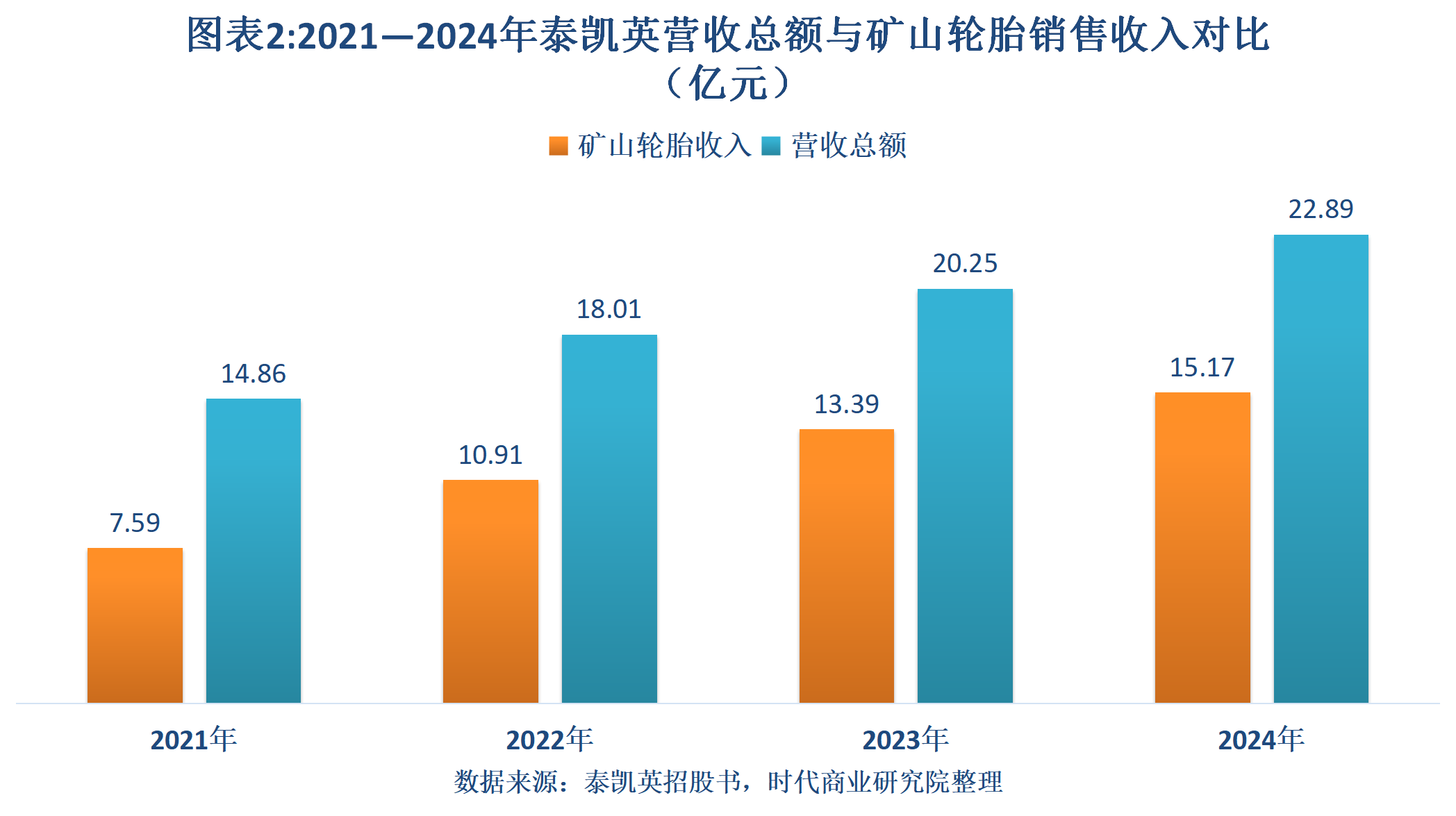时代商业研究院测算,2022—2024年,泰凯英营收同比增加额分别为3.15亿元、2.24亿元、2.65亿元;同期,矿山轮胎销售收入同比增加额分别为3.32亿元、2.48亿元、1.78亿元,可见,矿山轮胎是泰凯英业绩增长的主要驱动力。