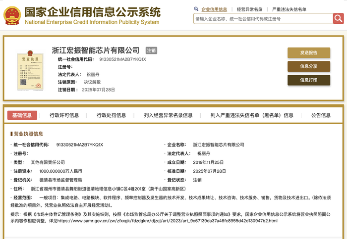 国家企业信用信息公示系统网站显示,浙江宏振智能芯片有限公司登记状态由存续变更为注销,注销原因为决议解散,注销日期为2025年7月28日。