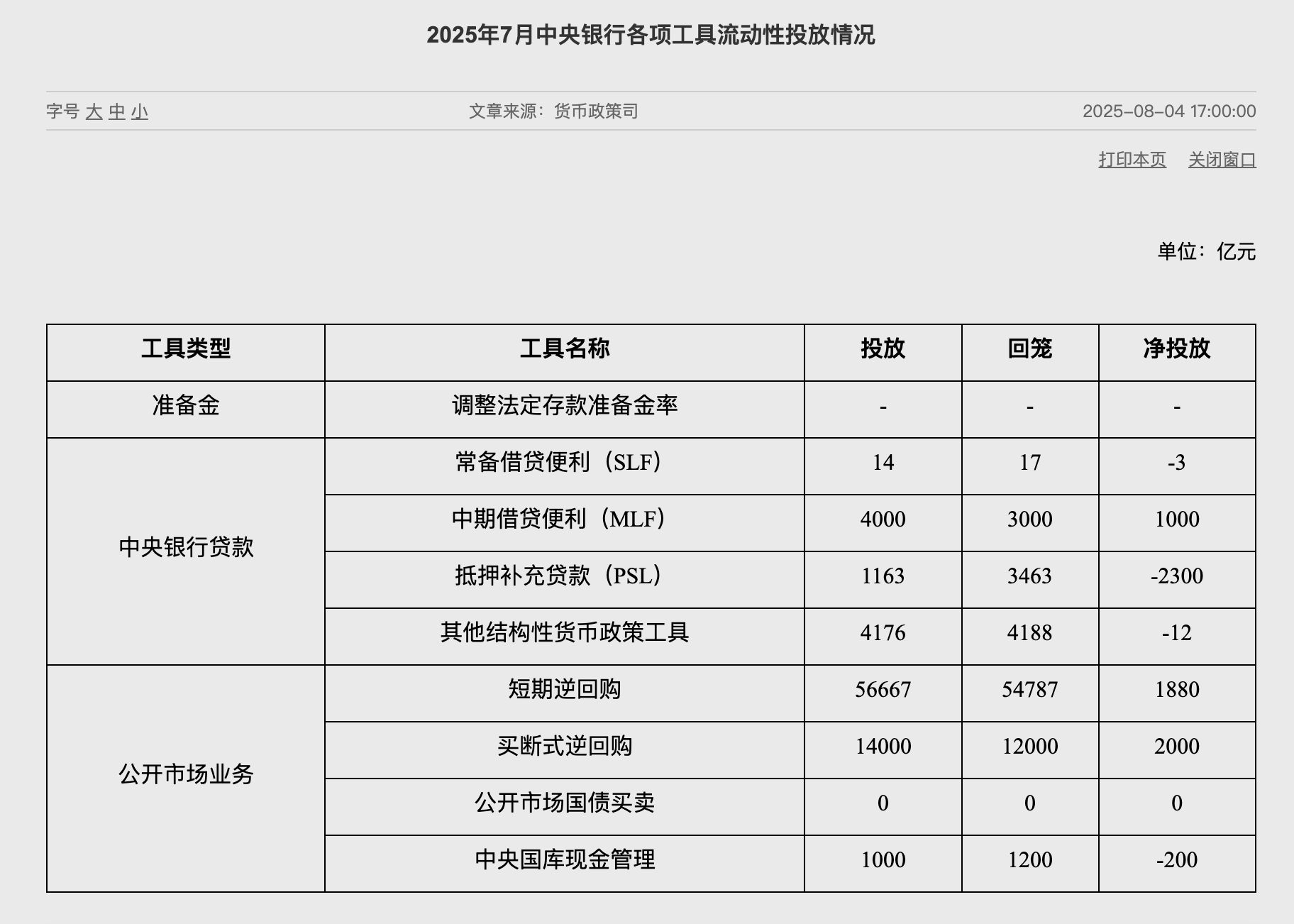 2025年7月央行流动性投放:MLF与逆回购共释3000亿