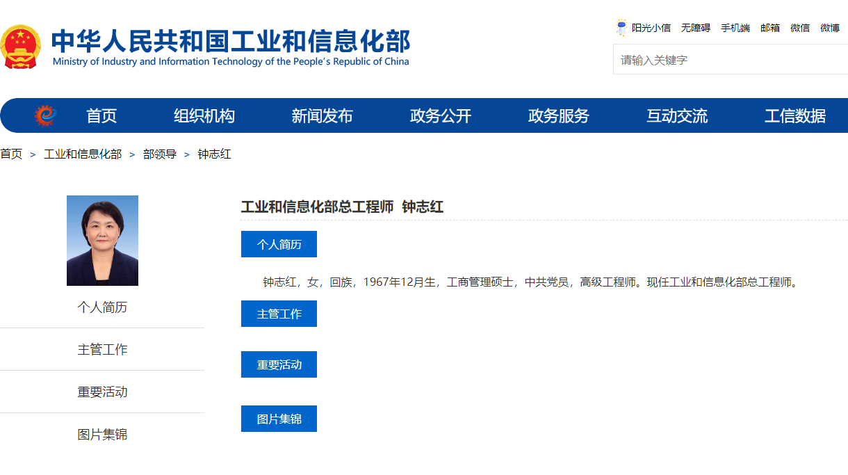 红星资本局8月4日消息,今日记者从工业和信息化部网站获悉,钟志红任工业和信息化部总工程师。工业和信息化部官网显示,钟志红,女,回族,1967年12月生,工商管理硕士,中共党员,高级工程师,现任工业和信息化部总工程师一职。