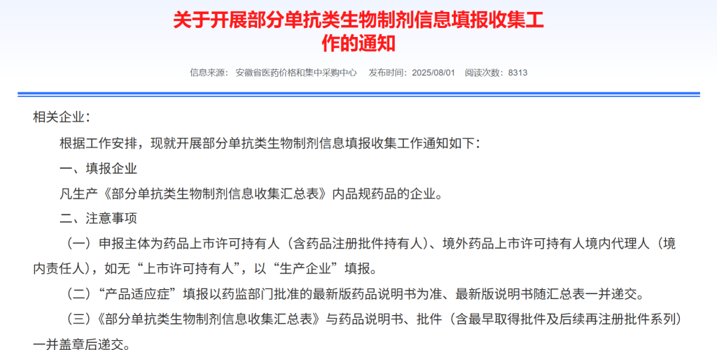 8月1日,安徽省医药集中采购平台发布《关于开展部分单抗类生物制剂信息填报收集工作的通知》,针对8款单抗类生物类似药,要求生产企业填报销售情况、产能、获批适应症等信息。