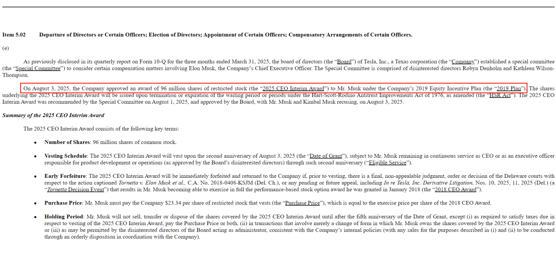 文件中提到,如在归属前,特拉华州法院作出相关判决或裁决,导致马斯克能够全额行使其2018年1月获授的基于业绩的股票期权奖励(“2018年首席执行官奖励”),则2025年首席执行官临时奖励将立即没收并返还公司。