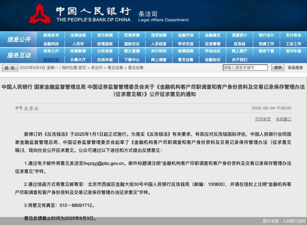 金融领域的反洗钱监管持续升级中。8月4日,中国人民银行等三部门发布《金融机构客户尽职调查和客户身份资料及交易记录保存管理办法(征求意见稿)》,向社会公开征求意见,意见反馈截止时间为2025年9月3日。