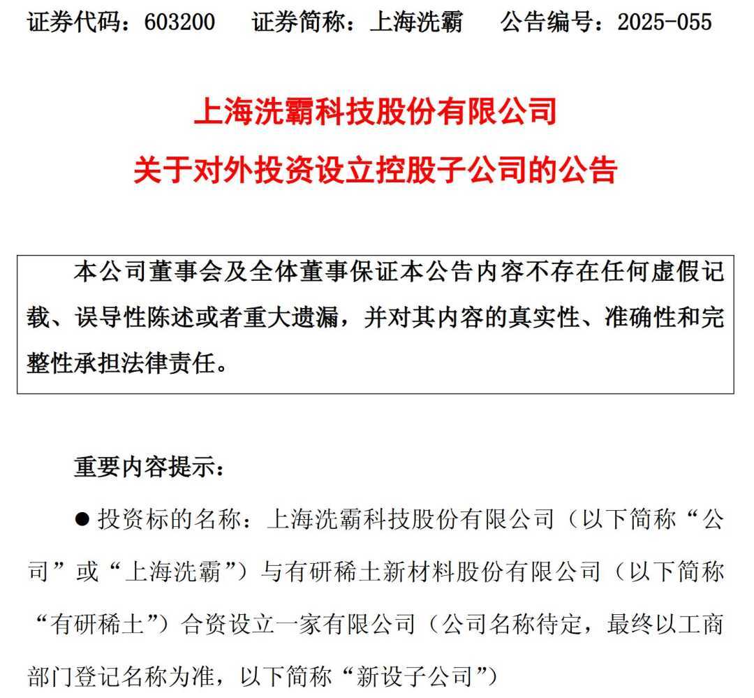 公告显示,新设子公司注册资本2亿元,上海洗霸出资1.65亿元,占82.5%;有研稀土出资3500万元,占17.5%。