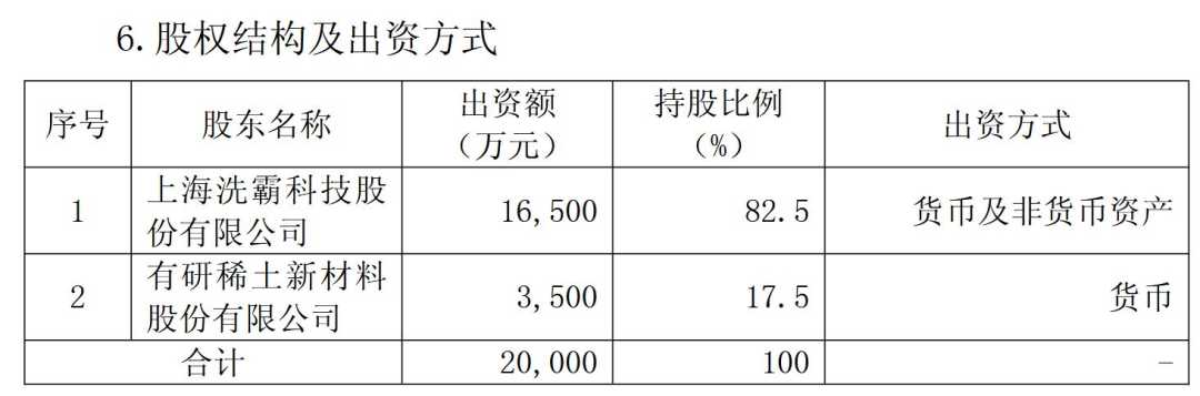 从出资细节看,上海洗霸以货币及非货币资产出资,非货币资产为硫化锂业务相关的技术、设备等资产。有研稀土以货币出资。