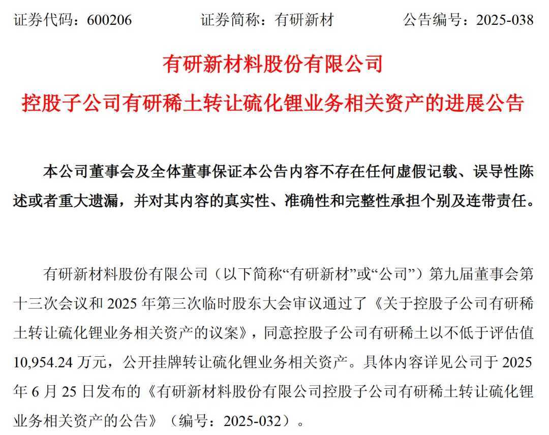 据《每日经济新闻》此前报道,6月24日晚间,有研新材公告称,其控股子公司有研稀土计划转让硫化锂业务相关资产。