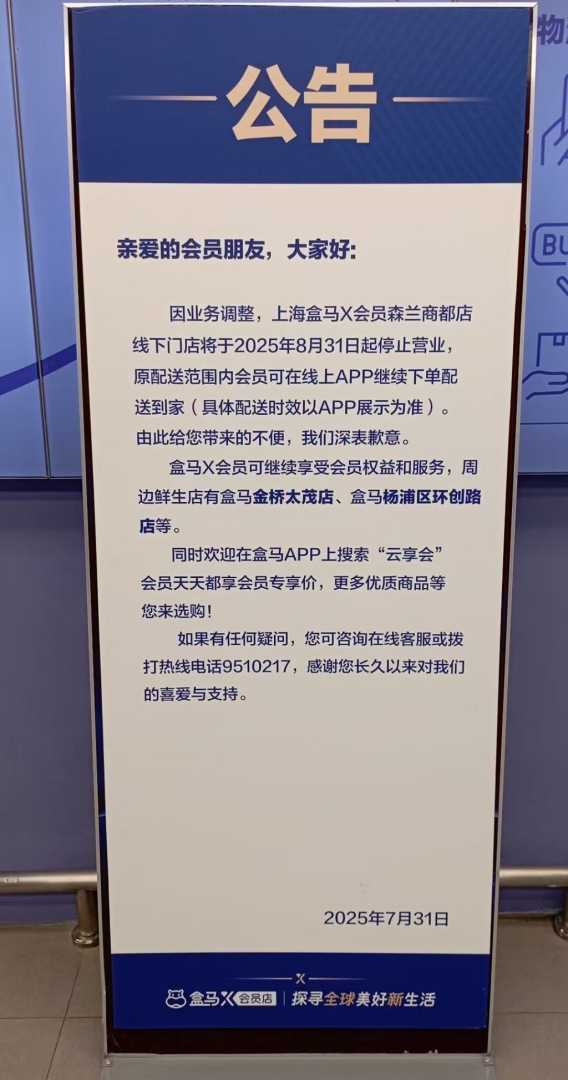 8月5日消息,盒马X会员店上海森兰商都店也将在8月31日起停止营业,这是盒马在全国仅余的一家会员店。