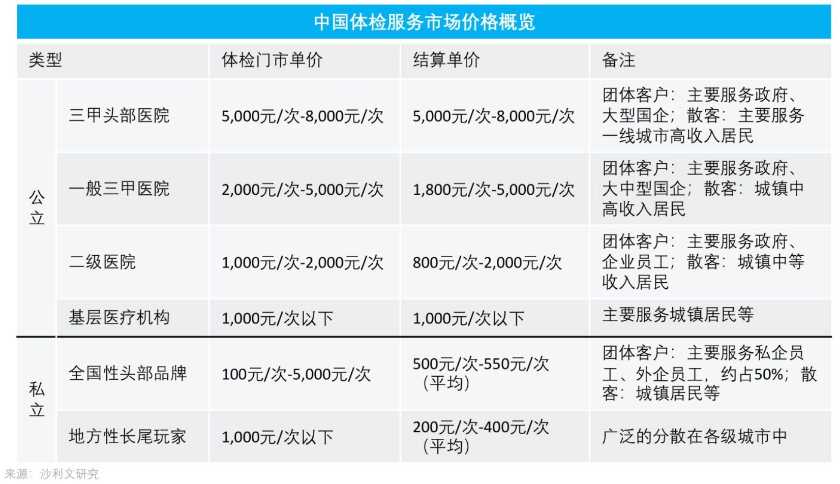 据《中国综合健康管理服务产业趋势洞察白皮书》,基层医疗机构多提供1000元以下的基础体检服务;二级、三级医院体检客单价在1000元/次至2000元/次;头部三甲医院客单价大多处于5000元/次至8000元/次。连锁体检机构客单价平均在500元/次至600元/次。