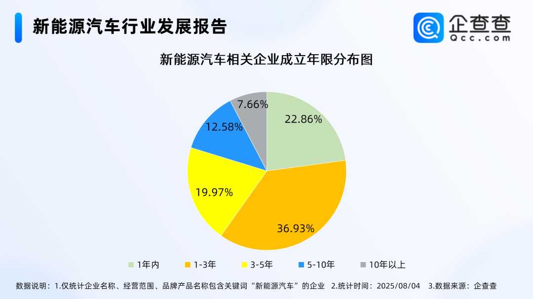 企查查数据显示,截至8月初,国内现存新能源汽车相关企业135.64万家。从经营时间来看,成立年限在1-3年的相关现存企业最多,占比36.93%。其次,成立年限在1年内、3-5年的相关现存企业分别占比22.86%、19.97%。注册量方面,2024年全年注册相关企业31.39万家,截至目前,今年已注册19.04万家,其中前7月已注册18.93万家,同比增长5.17%。