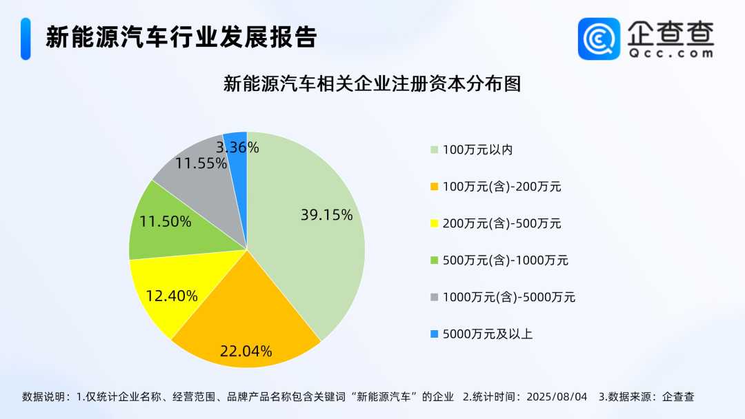 企查查数据显示,从注册资本来看,注册资本在100万元以内的新能源汽车相关现存企业最多,占比39.15%。其次,注册资本在100万元(含)-200万元、200万元(含)-500万元的相关现存企业分别占比22.04%、12.40%。
