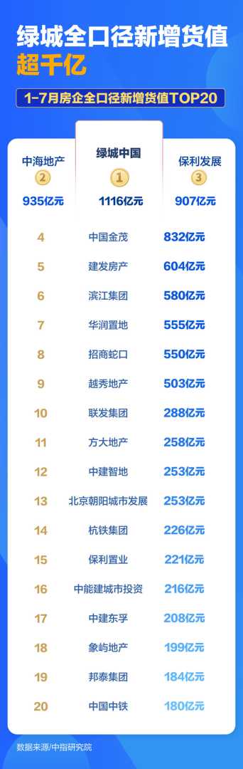 从新增货值来看,1-7月,绿城中国、中海地产和保利发展位列前三。绿城中国以1116亿元新增货值占据榜单第一,中海地产以935亿元新增货值位列第二,保利发展以907亿元新增货值位列第三。TOP10房企1-7月新增货值总额6871亿元,占TOP100企业的43.5%,头部企业集中度进一步提升。