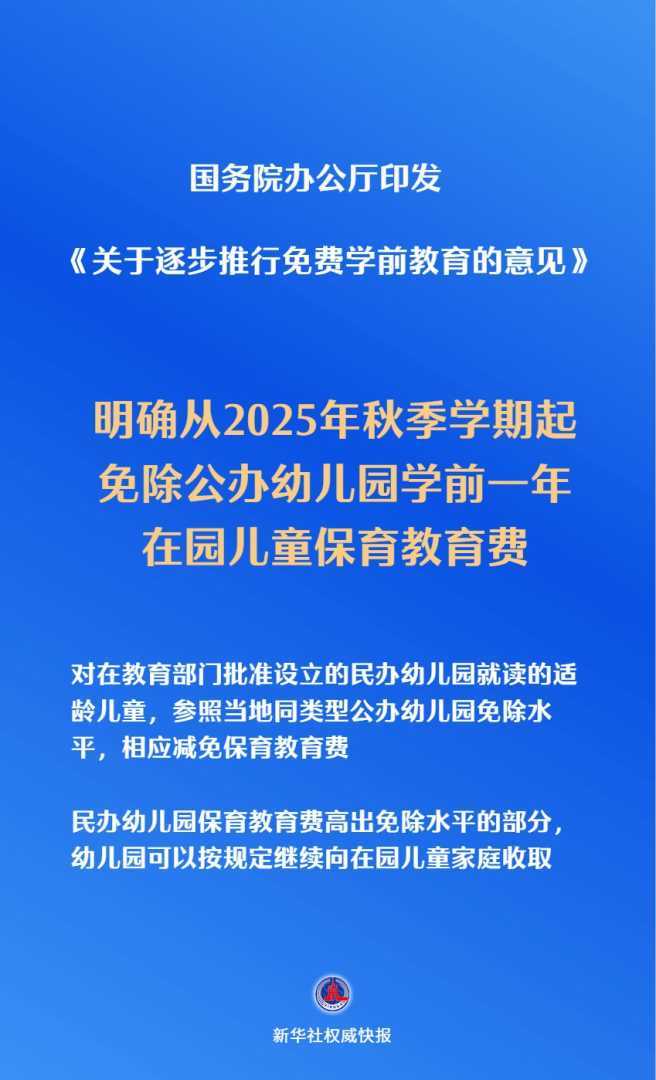 国务院办公厅印发《关于逐步推行免费学前教育的意见》,从2025年秋季学期起免除公办幼儿园学前一年在园儿童保育教育费,民办幼儿园参照执行,财政部门将对收入减少部分进行补助。