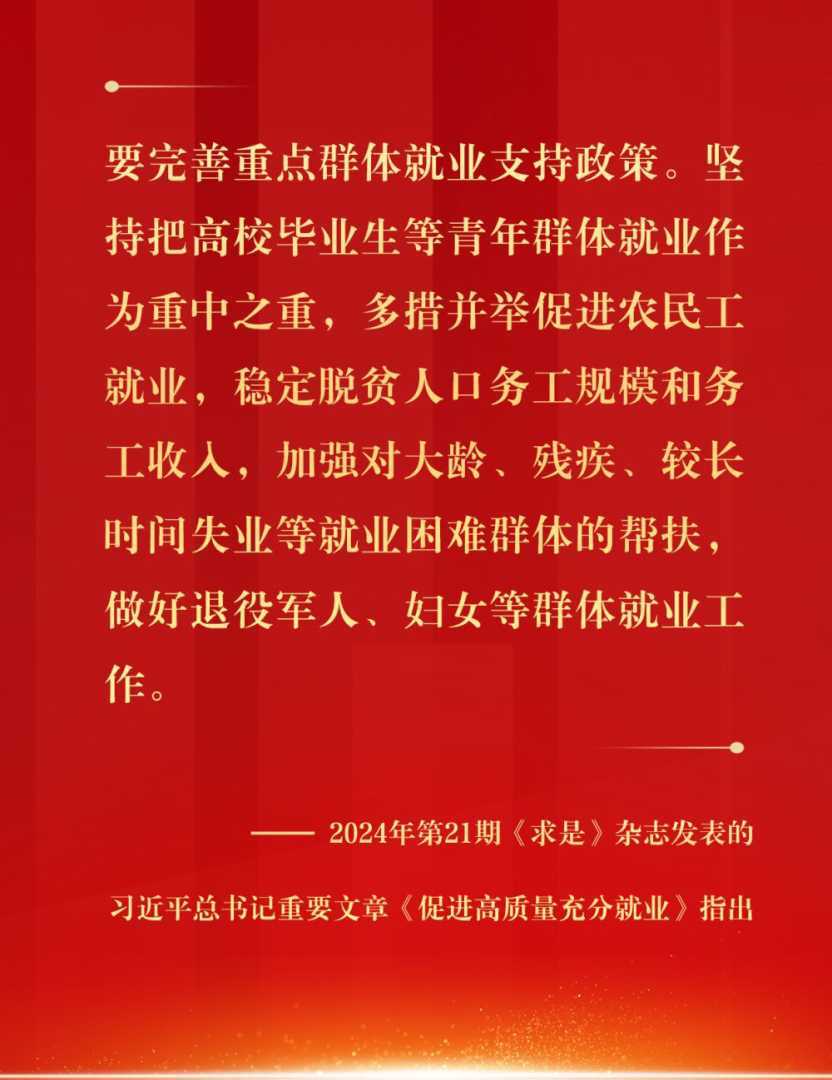 精准帮扶重点群体,完善就业支持政策,暖心的就业服务为更多人群创造就业机会,提升就业质量。2023年9月18日,重庆市城口县“忘我”大漆艺术空间,残障员工打磨漆器产品。2025浙江·杭州技能人才校企合作洽谈会现场,为青年群体搭建高质量就业服务平台。2025年5月16日,“助残有芯·就业有梦”2025年深圳市“就业助残”现场招聘会举办。2025年3月27日,回迁居民在雄安新区“雄业创工坊”包装工坊加工无纺布。