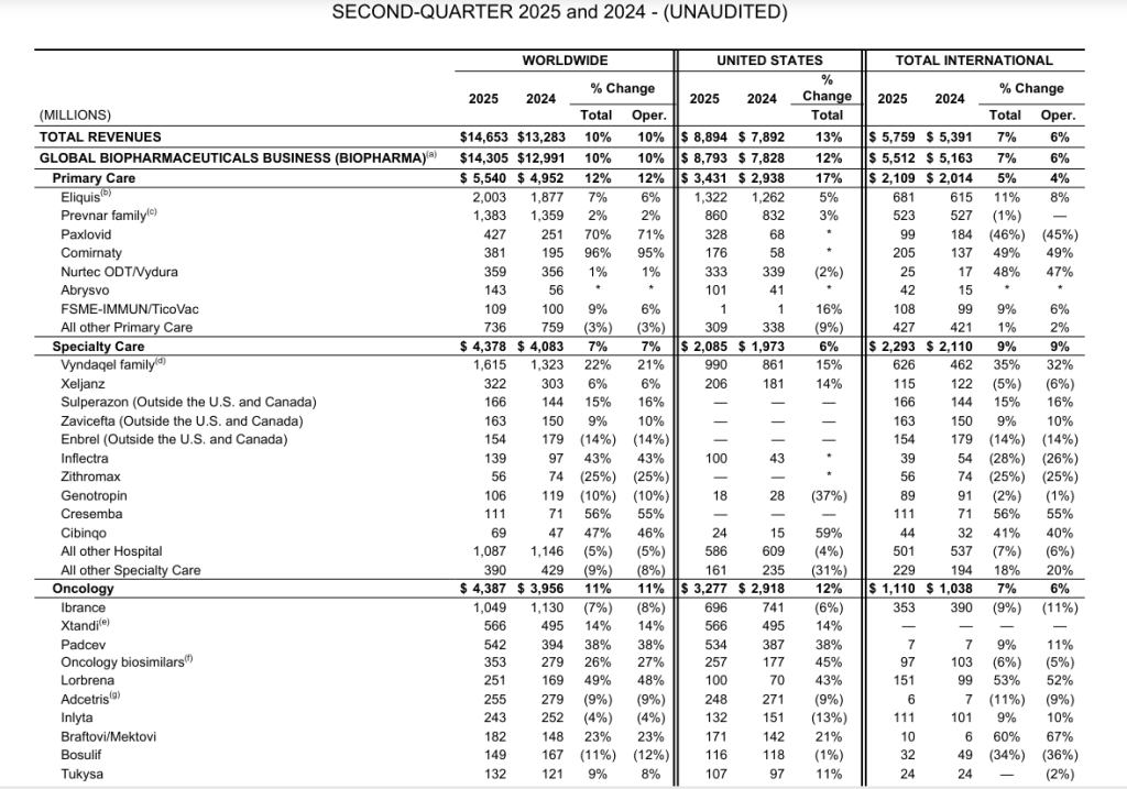 辉瑞二季度产品收入表现
