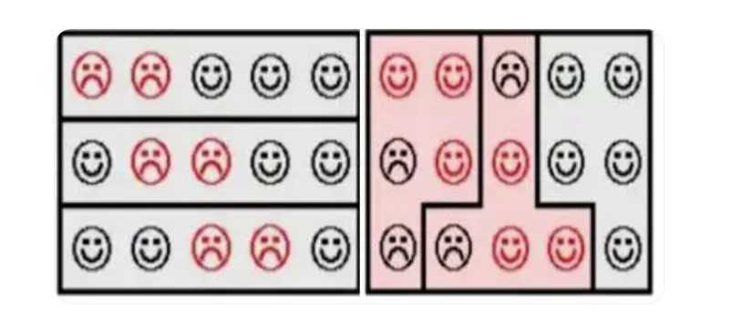 上图是个简化的例子,通过不同的区域划分,黑方在左图的每个区域中都占据多数,对红方取得了3:0的优势。但按右图的方式划分,红方反而取得了2:1的领先。