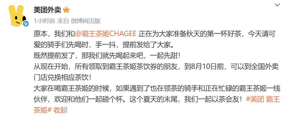 8月6日晚间,美团外卖官方微博回应称:“原本,我们和@霸王茶姬CHAGEE正在为大家准备秋天的第一杯好茶,今天请可爱的骑手们先喝时,手一抖,提前发给了大家。既然提前发了,那我们就先喝起来吧,一起先甜!”