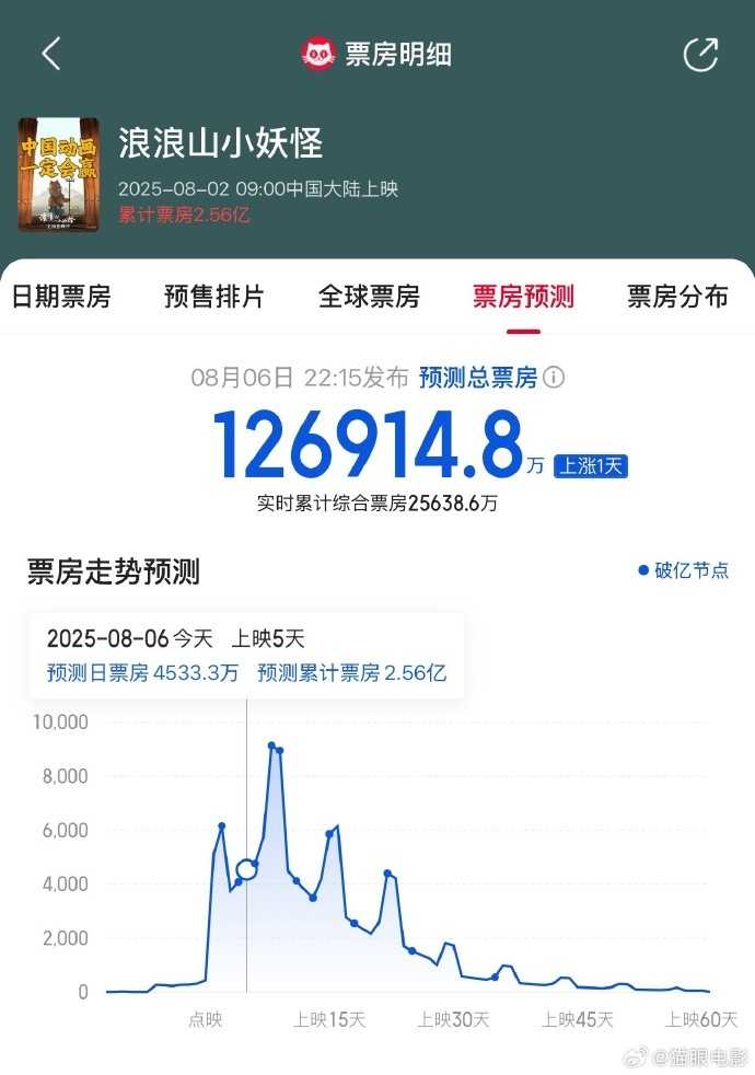 8月6日,据猫眼专业版预测票房数据显示,电影《浪浪山小妖怪》预测总票房高达12.69亿,这一数字无疑彰显了该影片的强劲市场表现和观众的高度期待。票房的持续走高,不仅反映了影片本身的品质与吸引力,也预示着其在市场上的巨大潜力。