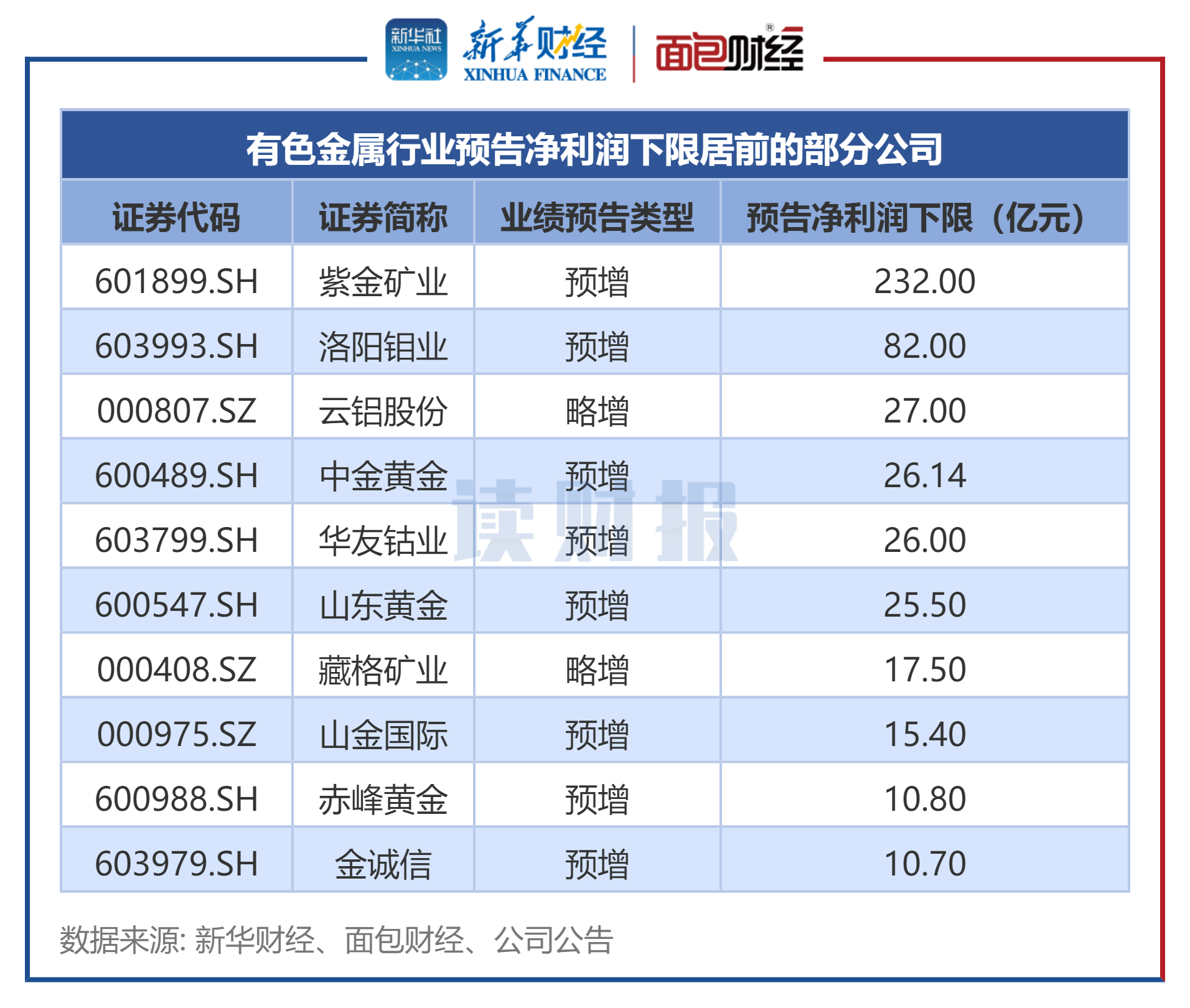 数据显示,紫金矿业、洛阳钼业、云铝股份的预告净利润规模下限位列前三。