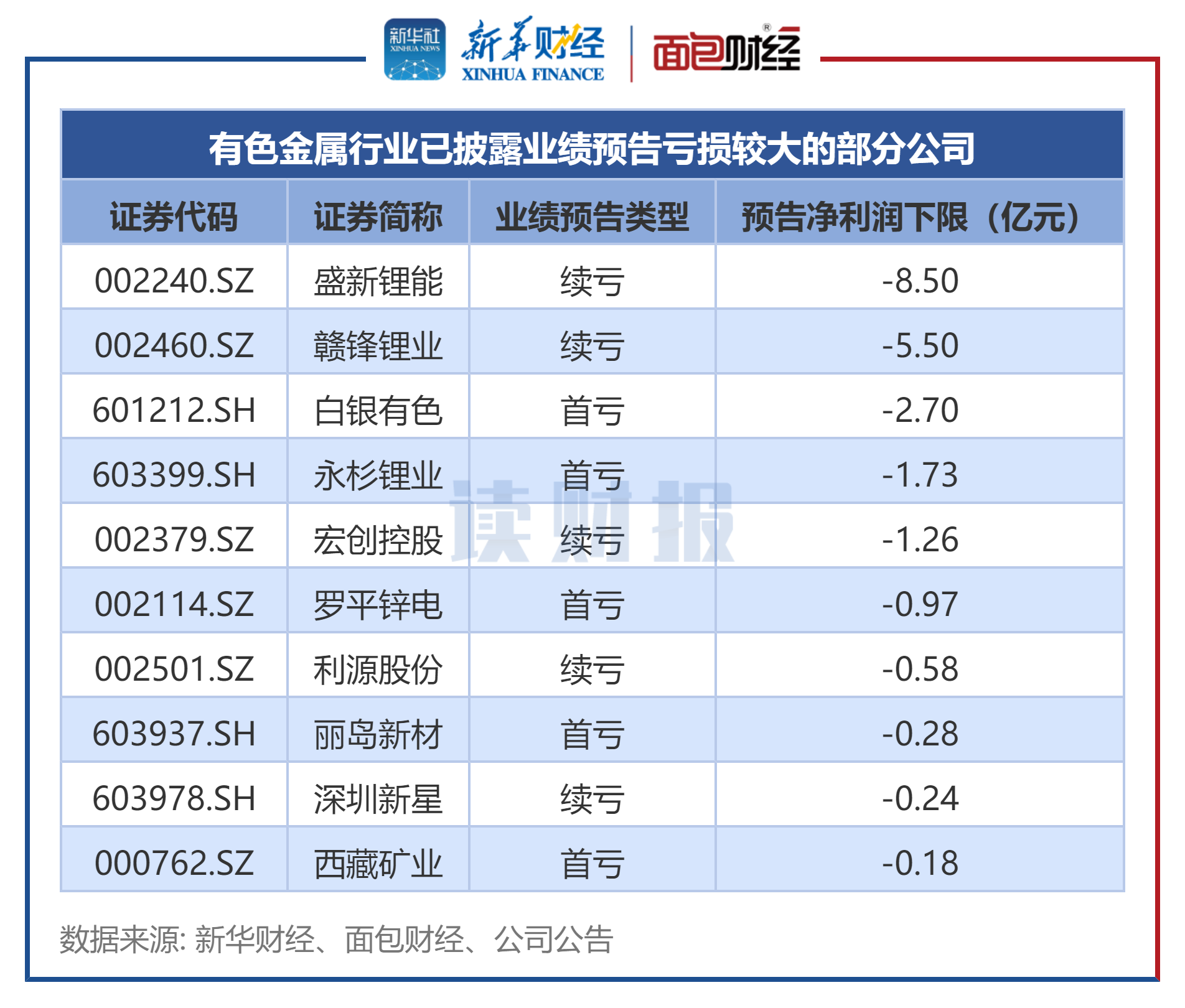 统计数据显示,有色金属行业所有公布业绩预告的公司中有10家亏损,其中,预告净利润下限排名前三位的公司分别是盛新锂能、赣锋锂业及白银有色。