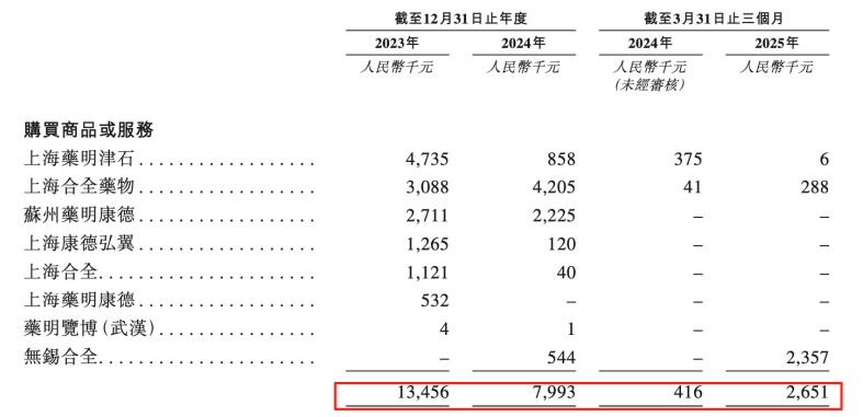 招股书显示,2023年至2025年一季度,丹诺医药向前五大供应商的采购额占比显著提升。其中,“供应商B”在2025年一季度跃升为第一大供应商,采购额占比攀升至53.5%,经进一步分析可知,该供应商为公司股东药明康德。
