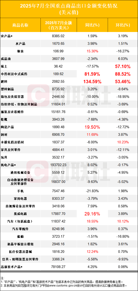 财联社整理今年7月重点商品出口金额变化情况发现: