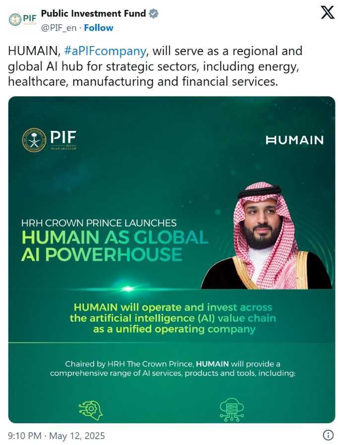 HUMAIN的推出将支持沙特“2030愿景”的落地,该愿景的目标之一是2030年跻身全球人工智能领域前15强。