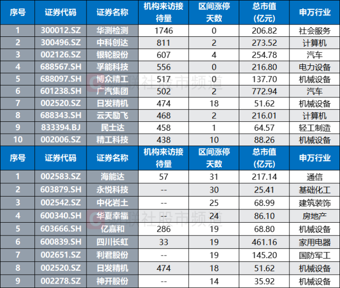 对于可关注标的,筛选低空经济概念股,华测检测、中科创达等股近1年机构调研量居前;海能达、永悦科技等股近1年涨停次数较高。