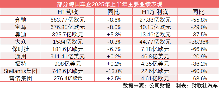 财联社记者梳理了九家跨国车企2025年上半年业绩表现,尽管多数车企营业收入未出现明显波动,但净利润却集体遭遇“重创”。最新公布的财报数据显示,九家车企的净利润全部出现两位数同比下滑,最小跌幅为通用汽车的20.9%,奔驰、保时捷、Stellantis、福特、雷诺的跌幅均超五成。跨国车企盈利情况受关税影响显著。