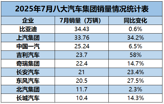 从规模上看,比亚迪与上汽集团月销量保持在34万辆上下,占据着领先地位。中国一汽、吉利汽车、奇瑞集团、长安汽车、东风汽车五家车企月销均超过了20万辆。北汽集团、长城汽车7月销量超过10万辆,距离上述七家车企仍存较大差距。