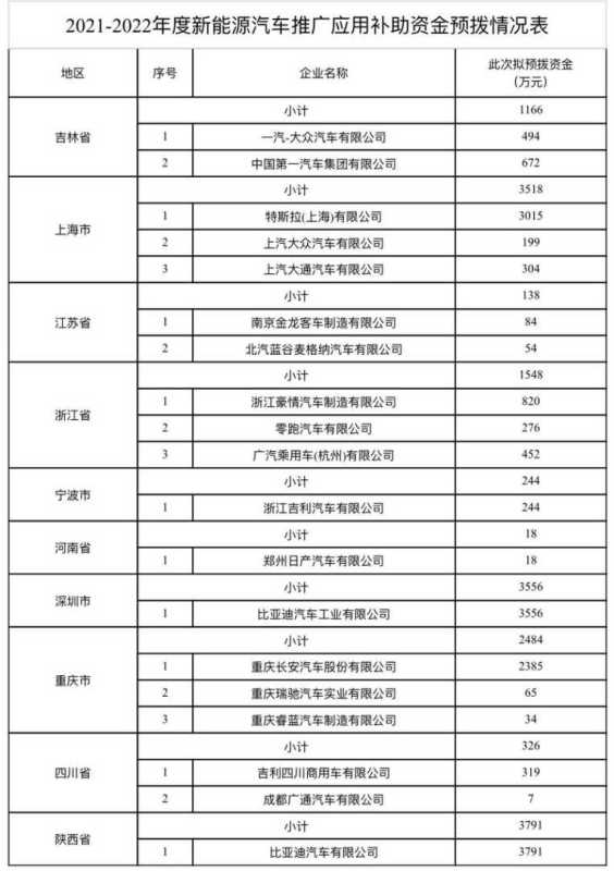 2021-2022年度新能源汽车推广应用补助资金预拨16789万元,涉及10个省市的19家企业。其中,陕西、深圳和上海获得的补贴金额较高,均超过3000万元,分别为3791万元、3556万元和3518万元。它们也是2021-2022年度我国新能源汽车生产量较高的省市。