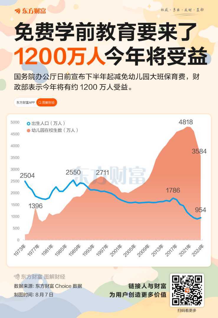 据东方财富Choice数据显示,截至2024年,幼儿园在校生数为3584万人,较2020年高点4818万人有所下降。出生人口从2016年的1786万人下降到2023年的902万人,降幅近50%。不过,去年出生人口有所回暖,达954万人,人口结构变化对学前教育影响深远。