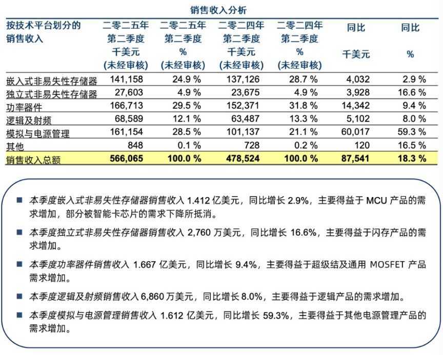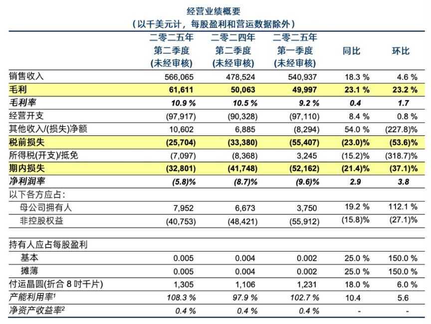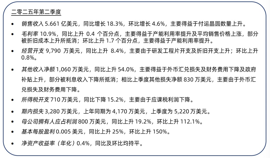 同日,华虹公司披露,公司第二季度销售收入5.661亿美元,同比增长18.3%,环比增长4.6%;毛利率为10.9%,同比提升0.4个百分点,环比提升1.7个百分点;母公司拥有人应占利润为800万美元,同比上升19.2%,环比上升112.1%。