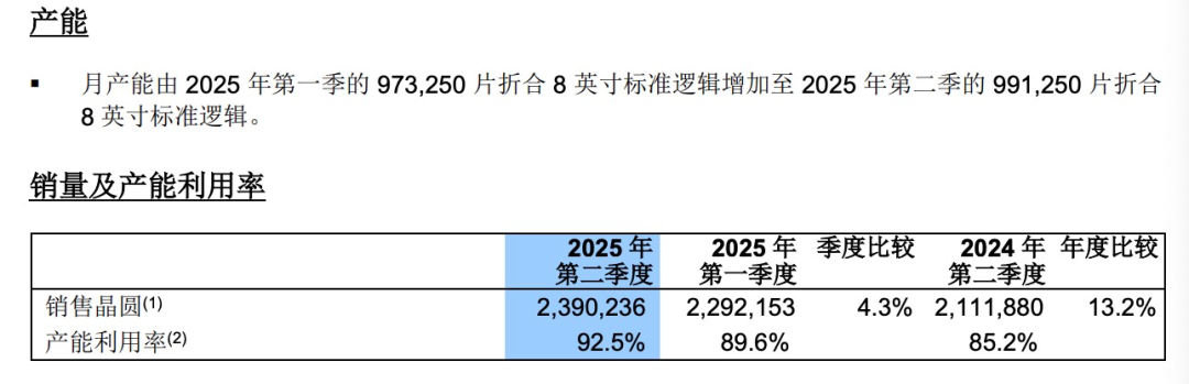 第二季度,中芯国际产能利用率大幅提升,接近满产。根据披露,公司第二季度产能利用率为92.5%,环比今年第一季度的89.6%增长了2.9个百分点,同比2024年第二季度的85.2%提升7.3个百分点。