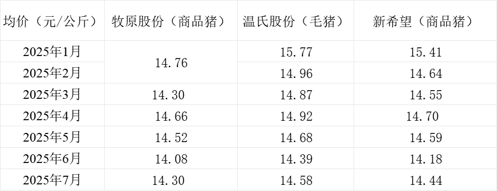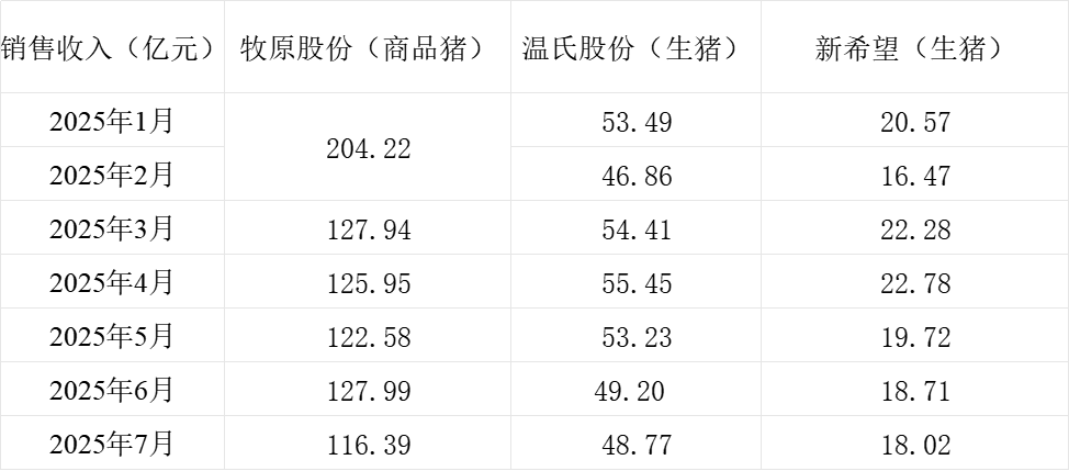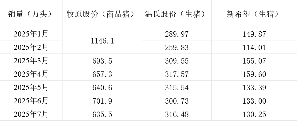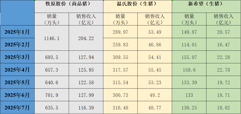 三大上市猪企牧原股份(002714.SZ)、新希望(000876.SZ)、温氏股份(300498.SZ)近日发布2025年7月生猪销售情况简报。
