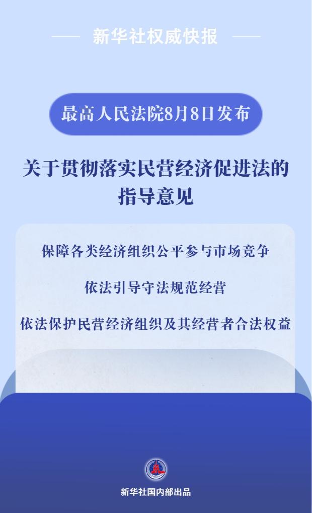 8月8日,最高人民法院发布关于贯彻落实《中华人民共和国民营经济促进法》的指导意见,提出25条具体措施,旨在破解民营经济发展难题,提供法治保障。